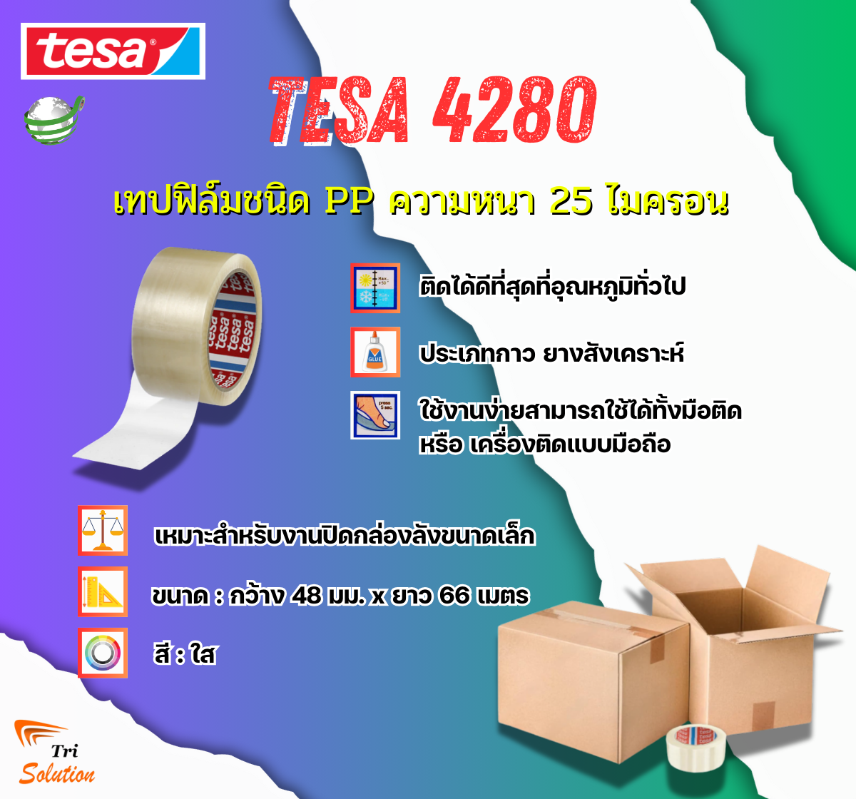 tesa® 4280 PV0 เป็นเทปกาวในตัวที่มีแผ่นรองหลังทำจากฟิล์มโพลีโพรพิลีน (PP) หนา 25 ไมโครเมตร และเคลือบด้วยกาวยางสังเคราะห์ เทปนี้เหมาะสำหรับการปิดผนึกและบรรจุกล่องที่มีน้ำหนักเบาถึงปานกลาง โดยทำงานได้ดีที่สุดเมื่อใช้งานในอุณหภูมิที่ไม่รุนแรงและในสภาพแวดล้อมภายในอาคาร